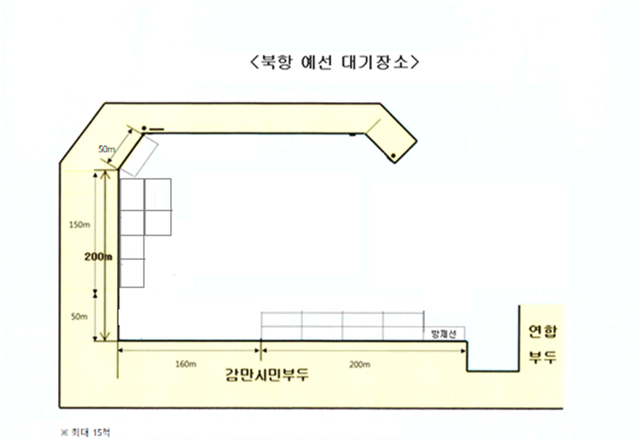 | 북항 | 감만시민부두 끝단(연합부두측)을 기준으로 남쪽 200m 지점까지의 안벽 및 전면 일정수역과 감만시민부두 끝단(신감만부두측)을 기준으로 북쪽으로 50m를 지난 지점으로부터 200m의 지점까지의 안벽 및 전면 일정수역 |