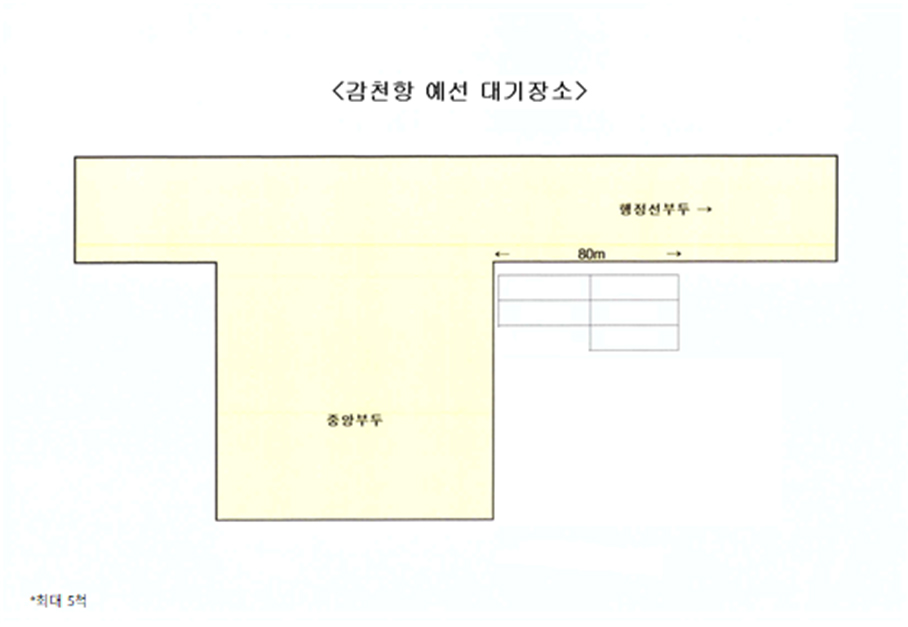 | 감천항 | 감천항 중앙부두 제5번 선석 끝단(행정선 부두측)으로부터 동쪽(행정선 부두측)으로 80m지점까지의 안벽 및 전면 일정수역 |