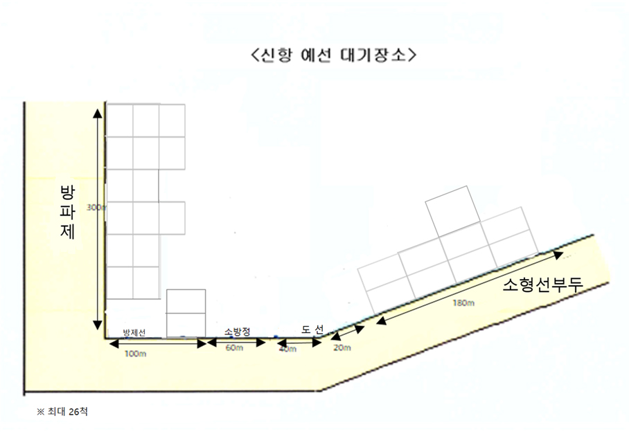 | 신항 | 소형선부두 서쪽끝단 200m지점으로부터 180m지점 및 서쪽끝단 500m지점부터 100m지점까지의 안벽 및 전면 일정수역,방파제 300m 전체 및 전면 일정수역 |